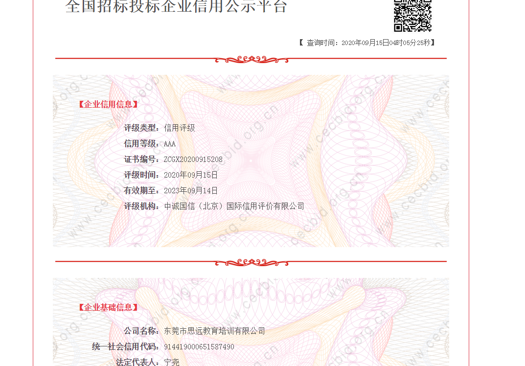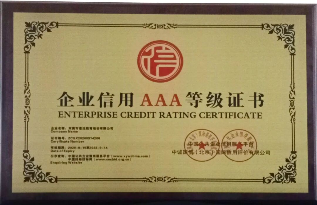 正是凭此,东莞思远教育才能在企业信用等级认定中,荣获“AAA级企业信用等级”的认证。